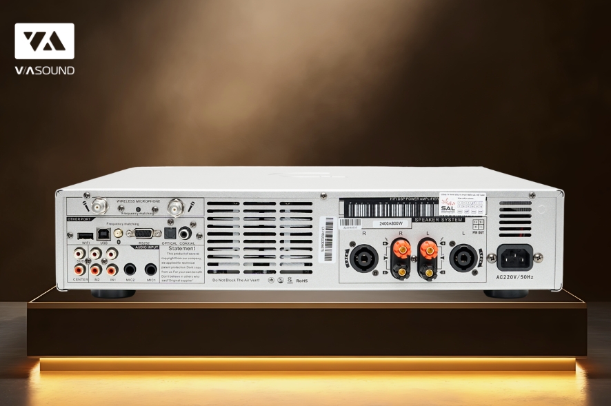 | Cổng kết nối input và output | Optical và Coaxial RCA 1&2 RCA Output SUB, CENTER (đầu ra sub và center rắc hoa sen) Kết nối USB computer Kết nối USB WIFI Kết nối RS232 Cổng micro |