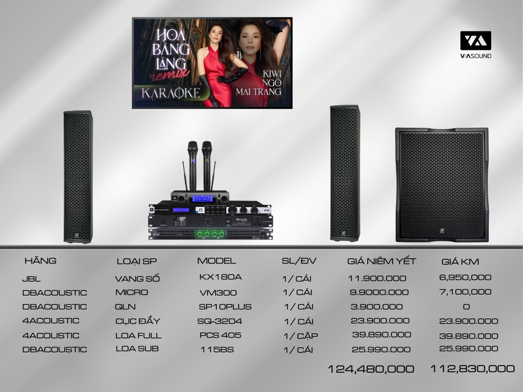 Combo karaoke 4M5 là lựa chọn đáng cân nhắc cho nhu cầu giải trí chất lượng với độ bền cao và âm thanh chuẩn mực. Được phối ghép từ DBAcoustic, JBL và 4Acoustic, đồng thời phân phối chính hãng bởi Vasound, hệ thống mang đến trải nghiệm ổn định và lâu dài.