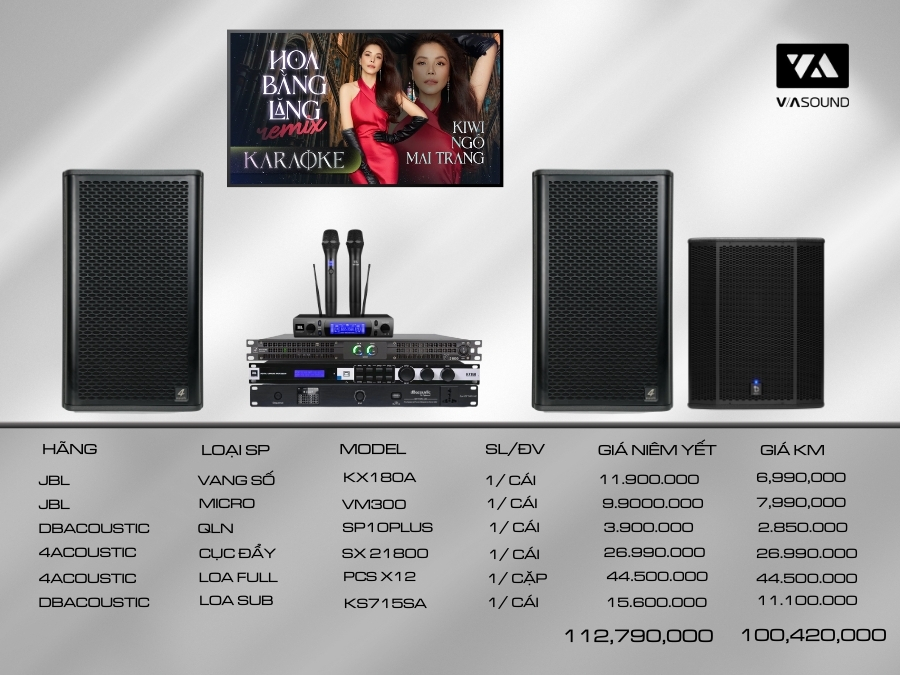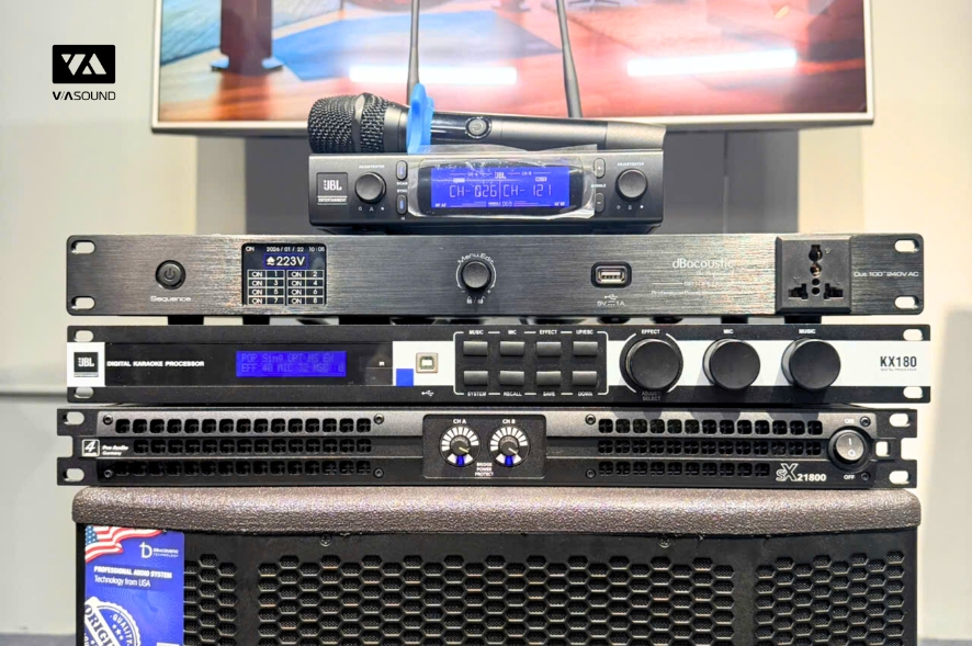 COMBO KARAOKE 4ACOUSTIC PCSX12 - 4M3 VANG SỐ JBL KX180A + MICRO JBL VM300 + CỤC ĐẨY 4ACOUSTIC SX 21800 + LOA 4ACOUSTIC PCS X12 + LOA SUBWOOFER DBACOUSTIC KS715SA + QUẢN LÝ NGUỒN DBACOUSTIC SP10PLUS