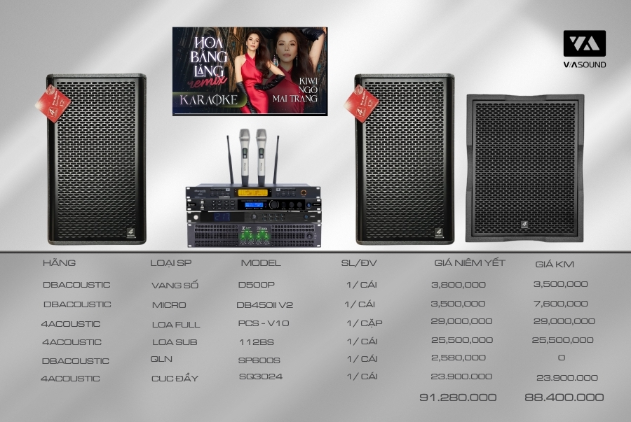 COMBO VANG SỐ DBACOUSTIC D500P + MICRO DBACOUSTIC DB450 II V2 + CỤC ĐẨY 4ACOUSTIC SQ3024 + QUẢN LÝ NGUỒN DBACOUSTIC SP 600S + LOA 4ACOUSTIC PCS – V10 + LOA SUBWOOFER 4ACOUSTIC 112BS