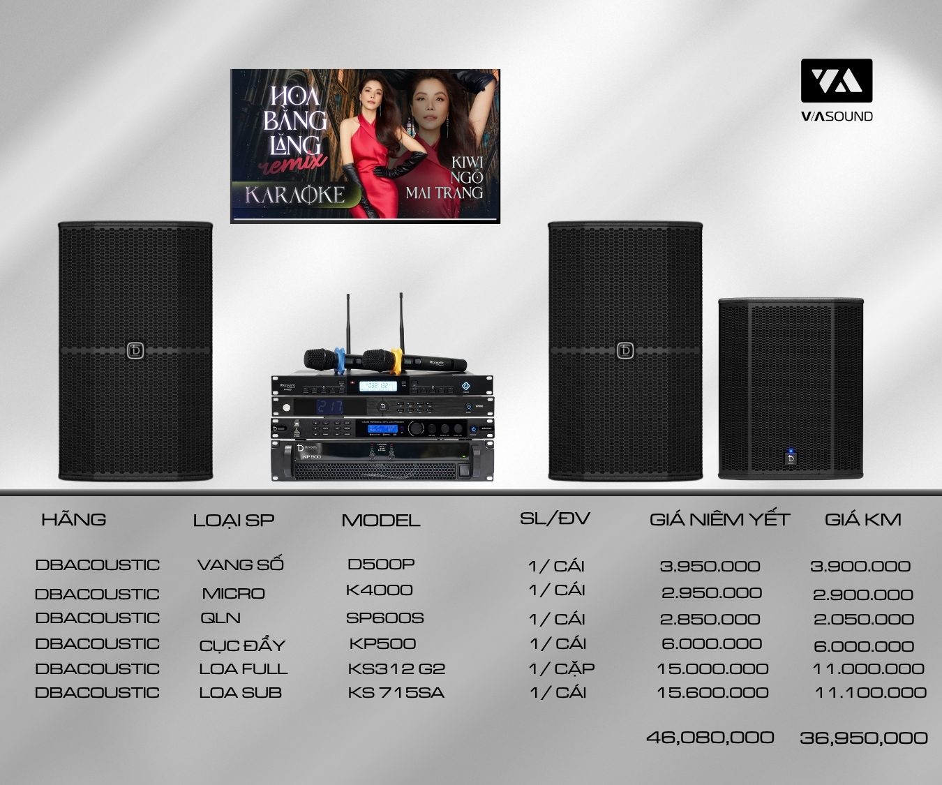 Combo karaoke được phối ghép bởi các thiết bị âm thanh có cấp đến từ thương hiệu âm thanh nổi tiếng DBacoustic. Các mẫu loa cao cấp được tinh chỉnh phù hợp với nhu cầu giải trí ca hát của nhiều gia đình hiện nay.