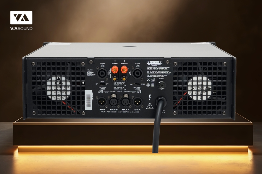 Hai bên thân tích hợp khe tản nhiệt lớn và tay cầm tiện lợi, giúp dễ dàng di chuyển, lắp đặt. Mặt sau bố trí cổng kết nối XLR, SpeakON NL4 cùng công tắc chọn chế độ Stereo / Bridge / Parallel và điều chỉnh độ nhạy đầu vào, mang lại tính linh hoạt và tương thích cao với mọi hệ thống âm thanh..