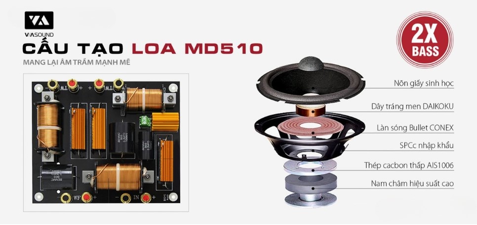 Loa Bass của MD510 sử dụng màng sợi tổng hợp tinh chế kết hợp viền nhún foam đặc biệt, tạo độ cứng – nhẹ lý tưởng, cho phép phản hồi nhanh, chính xác, âm trầm sâu, uy lực nhưng mượt mà, không bị ù rền. Dải trầm này vừa tăng sức sống cho nhạc EDM, vừa làm giọng hát Bolero, Pop thêm dày dặn và đầy cảm xúc.