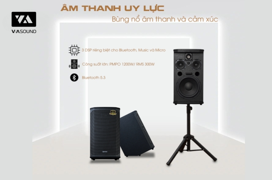 Công suất 300W RMS / 1200W PMPO, đáp ứng tốt nghe nhạc, karaoke và biểu diễn ngoài trời.