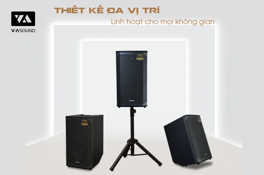 Thiết kế sang trọng, thùng loa chắc chắn kèm chân đứng cố định vững vàng, phù hợp mọi không gian.