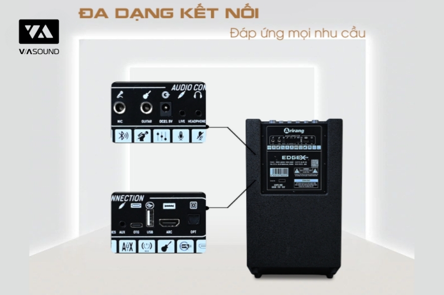 Bên cạnh kết nối không dây, EDGE-X Model I còn hỗ trợ HDMI ARC và Optical, cho phép kết nối trực tiếp với TV, tối ưu trải nghiệm xem phim và karaoke tại gia. Các cổng AUX 3.5mm, USB và thẻ nhớ giúp người dùng dễ dàng phát nhạc từ nhiều nguồn khác nhau, mang lại sự tiện lợi trong quá trình sử dụng.