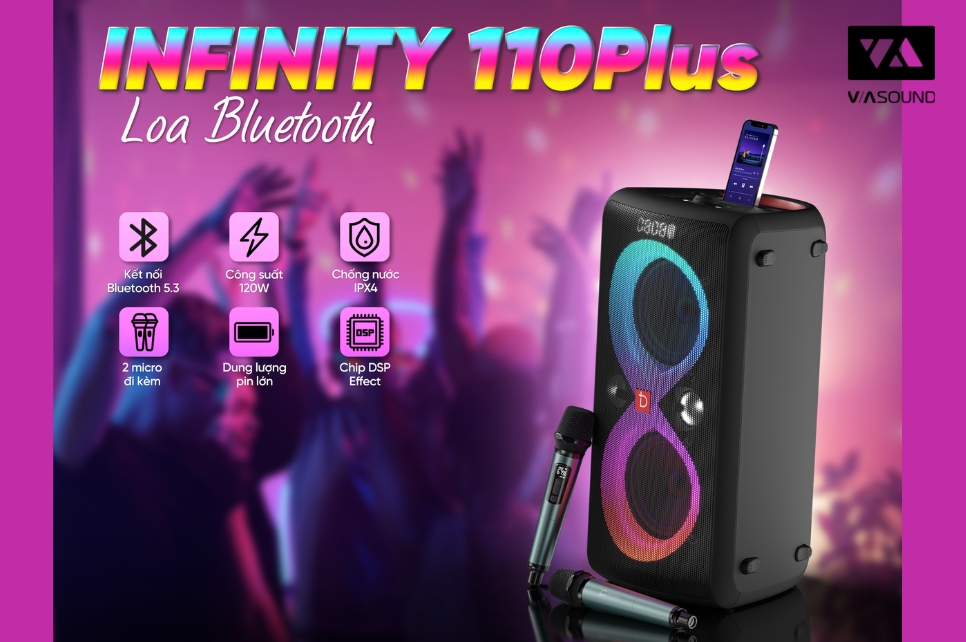 Loa di động Infinity 110Plus của Dbacoustic ra mắt 2024, nổi bật với thiết kế nhỏ gọn, đèn LED RGB cực chất và kết nối Bluetooth tiện lợi. Chất âm mạnh mẽ cùng khả năng hát karaoke ấn tượng giúp Infinity 110Plus trở thành lựa chọn lý tưởng cho mọi cuộc vui – từ giải trí tại nhà đến dã ngoại ngoài trời.