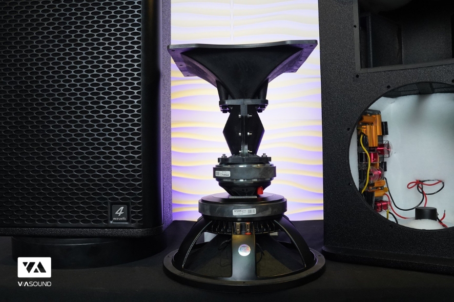 Loa 4Acoustic V12 được trang bị hệ thống củ loa cao cấp, bao gồm woofer 12 inch cho âm trầm mạnh mẽ và sâu lắng, với voice coil 2.5 inch đảm bảo hiệu suất ổn định và hạn chế méo tiếng. Driver treble sử dụng B&C DE250 (Italy), màng polyimide cao cấp, mang đến âm cao chi tiết, trong trẻo và tự nhiên.