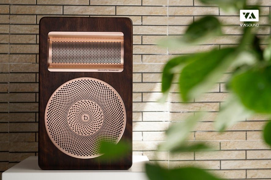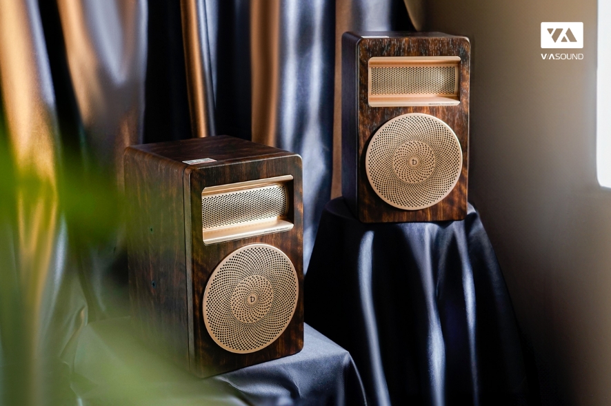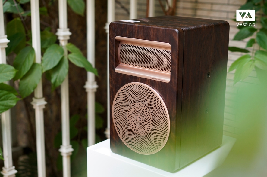 Thùng loa được chế tạo từ gỗ cao cấp phủ lớp sơn vân gỗ sang trọng, vừa tăng độ bền vừa giúp loa trở thành một món decor nội thất cao cấp. Điểm nhấn nổi bật nằm ở phần ê-căng hợp kim nhôm màu vàng hồng cùng logo chữ D đặc trưng đặt chính diện, tạo cảm giác cao cấp và dễ nhận diện thương hiệu.