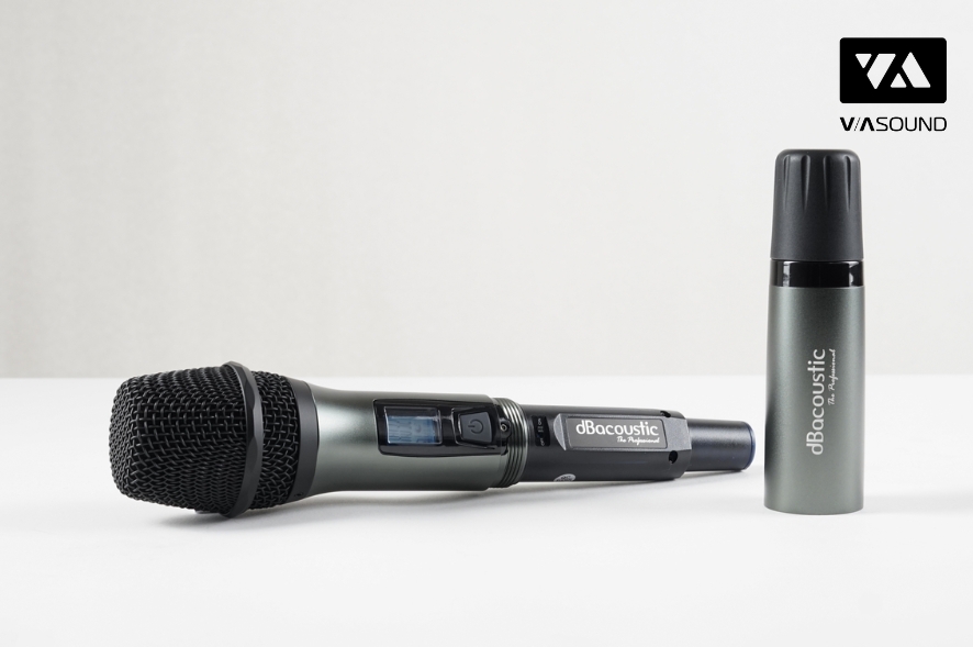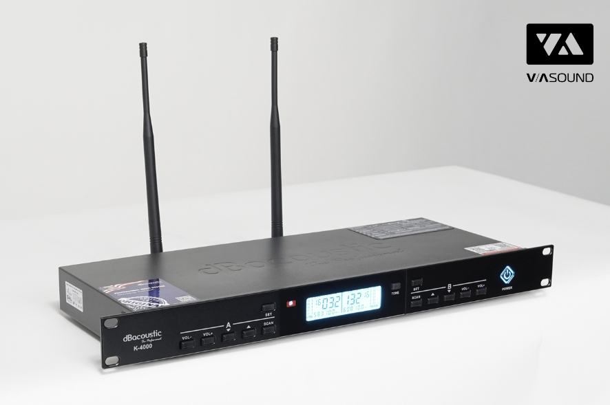 Bên cạnh đó, hệ thống nút điều chỉnh riêng cho từng micro, đèn LED báo hiệu, cùng logo thương hiệu DBacoustic được bố trí hài hòa tạo nên vẻ ngoài chuyên nghiệp. Mặt sau đầu thu là các cổng kết nối tiêu chuẩn, đầu vào nguồn điện và hai Ăng-ten giúp thu sóng ổn định, đảm bảo hoạt động mượt mà trong phạm vi rộng.