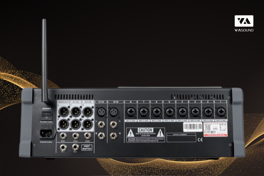 Mặt trước nổi bật với màn hình LCD hiển thị rõ ràng các thông số hoạt động, hỗ trợ người dùng quan sát và điều chỉnh nhanh chóng. Hệ thống núm chỉnh, cần gạt và các cổng tín hiệu được bố trí khoa học, chú thích đầy đủ, giúp thao tác trực quan ngay cả với người mới sử dụng mixer. Thiết kế này không chỉ tối ưu trải nghiệm vận hành mà còn rút ngắn đáng kể thời gian setup hệ thống âm thanh.