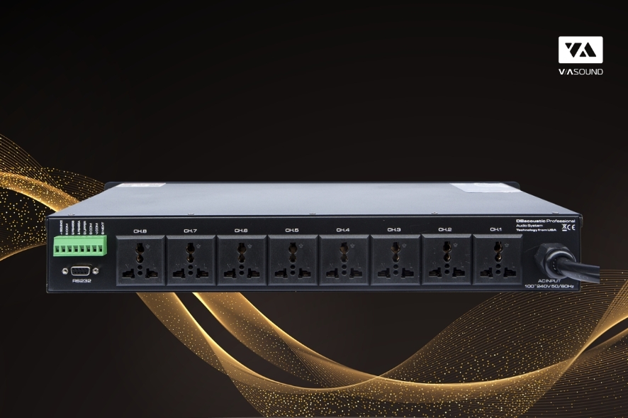 Ở mặt sau, hệ thống 8 ổ cắm nguồn CH1–CH8 được bố trí khoa học, đi kèm cổng điều khiển RS232 và ổ nguồn phụ, giúp việc đấu nối trở nên rõ ràng, an toàn và thuận tiện cho kỹ thuật viên trong quá trình thi công hoặc vận hành thực tế.