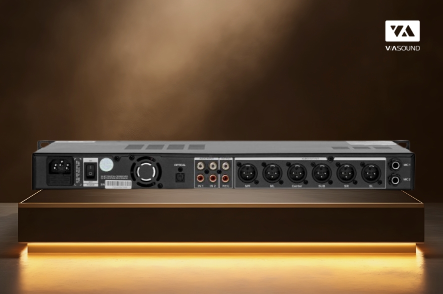 Mặt trước nổi bật với màn hình LED hiển thị sắc nét, cùng núm vặn và các cổng điều chỉnh Mic, Effect, USB được bố trí khoa học, cho phép người dùng thao tác nhanh chóng và chính xác. Ở mặt sau, các cổng kết nối tín hiệu vào/ra được chú thích rõ ràng, giúp việc phối ghép với các thiết bị âm thanh khác trở nên dễ dàng và thuận tiện hơn bao giờ hết.