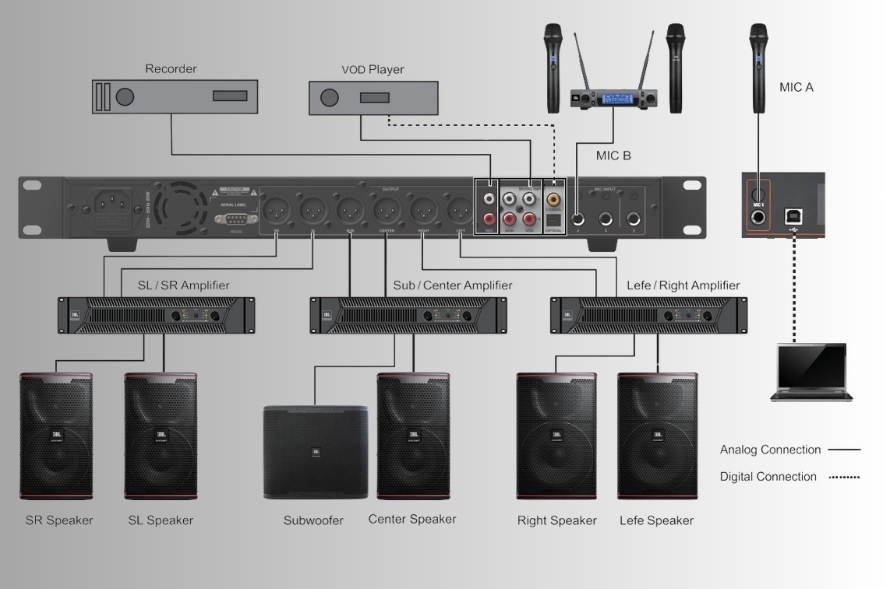Với hệ thống kết nối phong phú, JBL VX9 dễ dàng tích hợp cùng các thiết bị âm thanh phổ biến như micro karaoke, VOD Player, Recorder, amply SL/SR, loa sub, máy tính…. Tất cả giúp người dùng xây dựng một hệ thống âm thanh đồng bộ, mạnh mẽ và chuyên nghiệp, đáp ứng hoàn hảo cho mọi không gian giải trí.